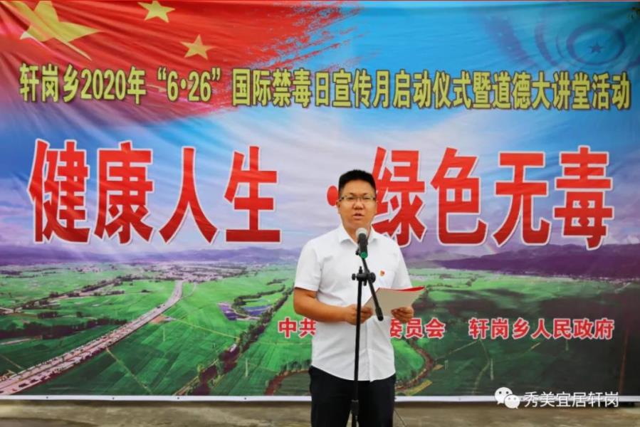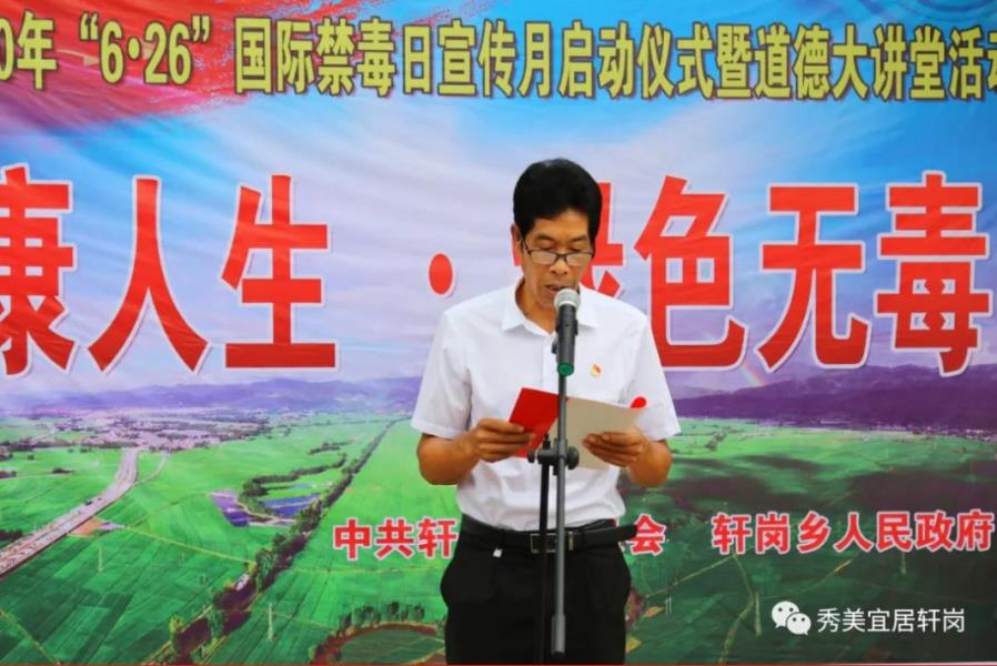 “健康人生,绿色无毒”。今年是第33个国际禁毒日,近日,轩岗乡举行了2020年“6·26”国际禁毒日宣传月启动仪式暨道德大讲堂活动。乡领导班子、全体干部职工、新时代文明实践志愿服务队、轩岗派出所、司法所、交警中队、卫生院、轩岗中小学代表共计100余人参加了活动。