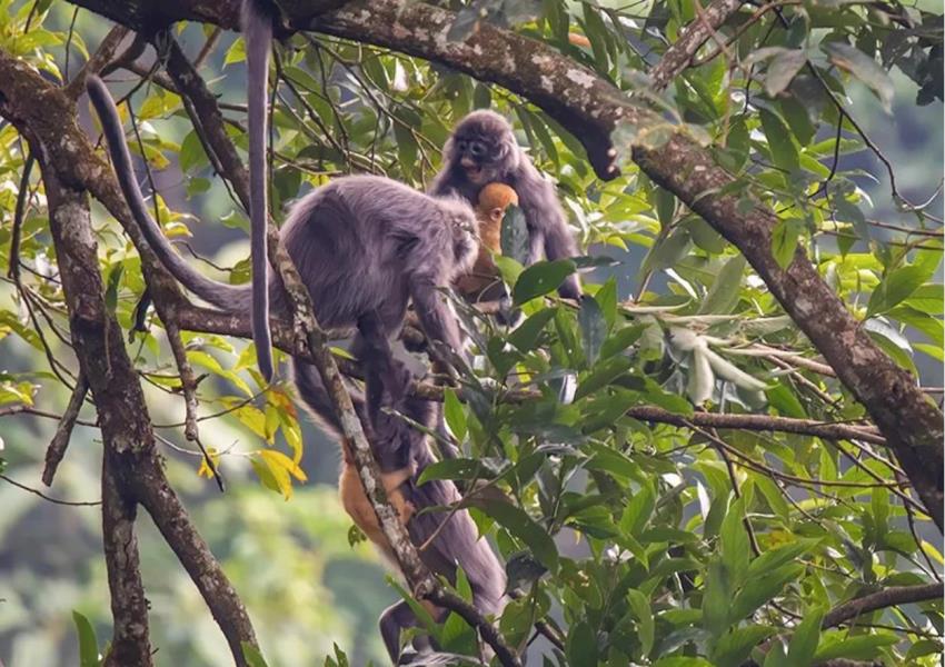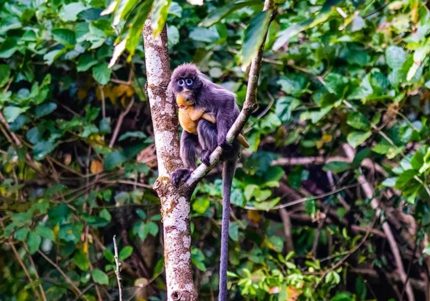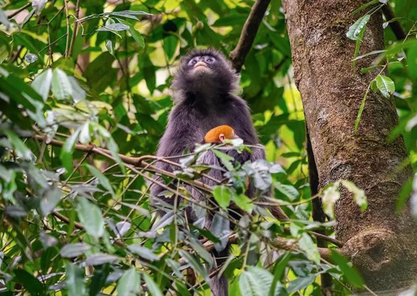 菲氏叶猴以树叶、果子为主食,小猴刚出生时全身金黄,十分可爱,所以当地人亲切地叫它们“小金猴”,猴宝宝在3个月左右时尾巴和头部毛色逐渐开始变灰。成年个体大大的眼睛和淡蓝色的眼圈非常漂亮,长长的尾巴也是它们的显著特征之一,长尾巴就是它们完成丛林穿越重要的“平衡器”。
