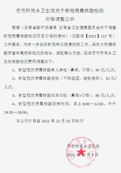 芒市轩岗乡卫生院关于新冠病毒核酸检测价格调整的公示