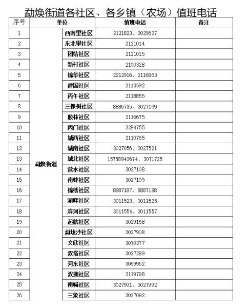 1.勐焕街道各社区和各乡镇(农场)值班电话