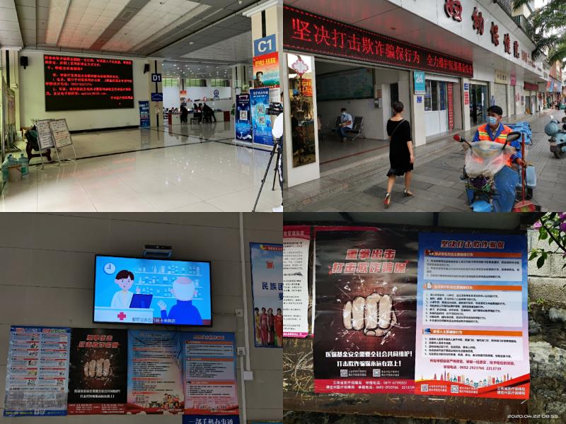 芒市医疗保障局通过与芒市融媒体中心合作制作宣传活动微视频,在全市100余家定点医药机构、芒市政务服务中心电子屏幕循环播放国家医保局制作的“打击欺诈骗保 维护基金安全”宣传动画短视频、宣传标语及在显著位置摆放宣传折页、张贴宣传海报等多种形式开展打击欺诈骗保维护基金安全活动宣传月,做到线上宣传广覆盖。使群众真正了解欺诈骗取医疗保障基金的违法行为、举报投诉渠道、举报奖励方法和基金监管相关法律法规等。