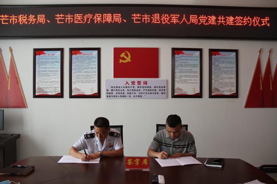 为深入贯彻落实省、州、市关于党建共建工作的部署要求,进一步推进“两学一做”学习教育,以党建促发展,加强紧密合作联系,5月18日,芒市税务局党总支与芒市医疗保障局党支部、芒市退役军人党支部举行了党建共建协议签约仪式。