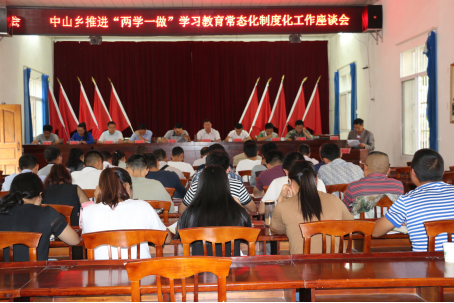 常态化制度化工作座谈会会议精神,进一步总结交流经验、研究解决问题,安排部署中山乡推进“两学一做”学习教育常态化制度化的各项工作。5月31日上午,中山乡在乡政府大会议室召开推进“两学一做”学习教育常态化制度化工作座谈会。乡党政领导班子、各村党总支书记、副书记、大学生村官、直属党支部书记、全体党政机关支部党员共计57人参会,会议由乡党委副书记、乡长徐龙主持。