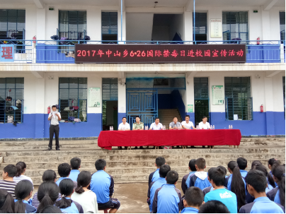 在“6.26”国际禁毒日这天,中山乡综治维稳办联合中山乡卫生院、中山乡边防派出所等单位到中山中学开展“6.26”国际禁毒日进校园宣传活动。
