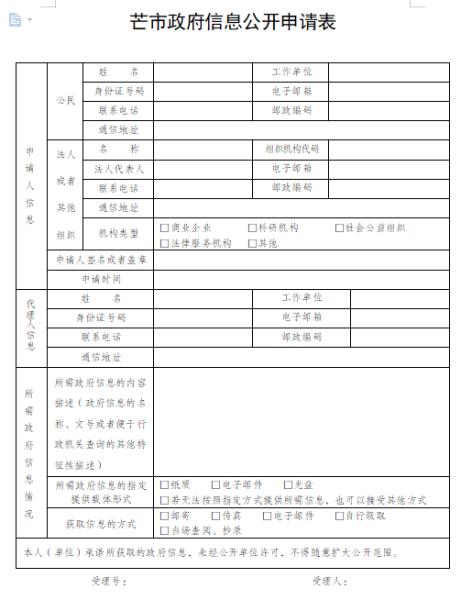 芒市政府信息公开申请表