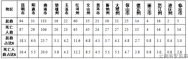 较大事故:文山州3起、12人;昭通市3起、11人;昆明市2起、9人;西双版纳州2起、8人;曲靖市2起、7人;楚雄州2起、7人;大理州2起、7人;普洱市1起、4人;红河州1起、3人;怒江州1起、3人;迪庆州1起、3人。