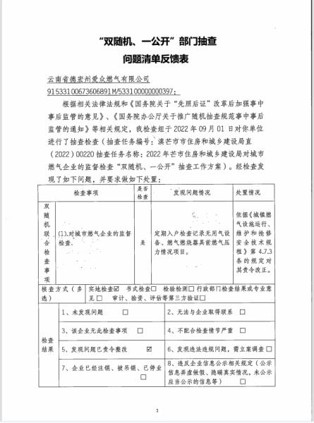 [附件: 2022年芒市住房和城乡建设局对城市燃气企业的监督检查“双随机、一公开”抽查告知书及问题清单反馈表]