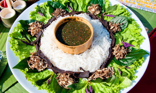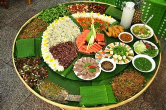 吃过景颇族“绿叶宴”,你对目前最流行的“纯天然绿色食品”的说法就会有全新的认识。坐在“绿叶宴”边,没有碗、没有勺、没有铁制的酒具,饭是竹筒烧的,菜是竹筒舂的,盛菜的是青翠的芭蕉叶,喝汤的勺是树叶折叠成的,就连酒杯也是竹节做成的,吃的是山茅野菜、纯香的土鸡,从内容到形式,从视觉到味觉,都远离了现代饮食的概念,仿佛所面对的是一席少数民族“智慧的盛宴”。