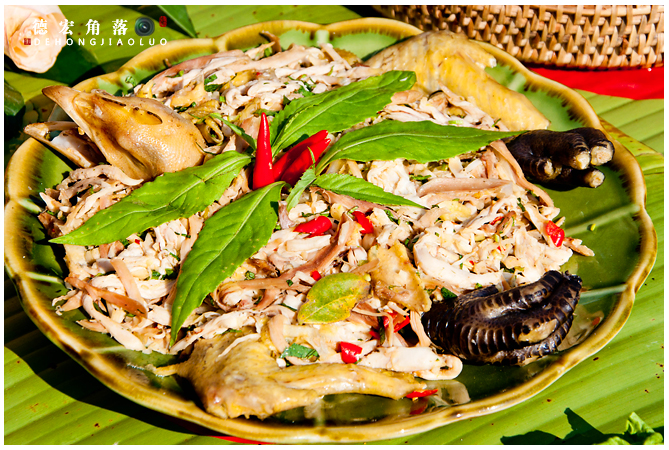 此菜可是有来历的,景颇族历史上有杀鸡祭鬼的习俗,“鬼鸡”就是供祭献鬼后,景颇族人将煮熟的鸡晾凉后撕碎,在野外佐以剁碎的姜、蒜、缅芫荽、柠檬叶等相关配料,配入盐、味精、酱油等调料制成。为了能常常吃到这道美味,聪明的景颇族人将“鬼鸡”端上了饭桌,并作为款待客人的上好佳肴。
