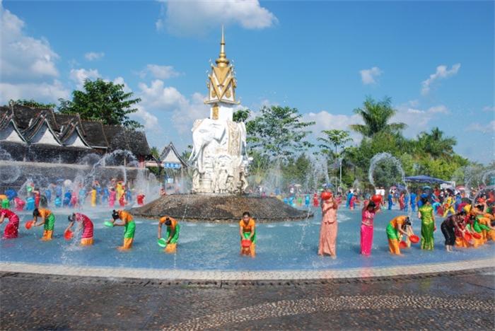 泼水节傣语泼水节称"摆爽南",德昂语称"拱拍",阿昌人称"浇花节"。它是傣历新年,是一年中最为盛大而隆重的节日。泼水节的来历传说较多,现普遍流传的是,很多年以前,有一个魔法无边的魔王,刀箭不入,水淹不死,火烧不烂,无恶不作。他抢来12个美丽的姑娘做妻子,个个恨死魔王。最小的聪明机敏,一直在想办法杀死这个妖魔。一天,终于从魔王口中探出秘密,只要用魔王的一根头发勒住魔王的脖子,就能把魔王的头勒下来。可是妖魔的头落地后,滚到哪里,哪里就大火成灾。为了使人间免除灾难,12个姑娘只好轮流抱着魔王头。于是人们用清水替姑娘冲洗身上的污秽,年复一年,形成了泼水节。