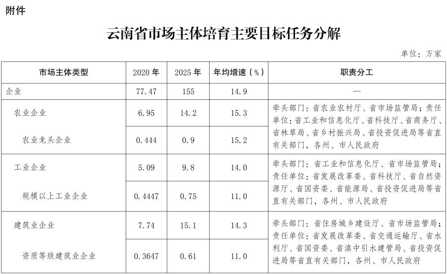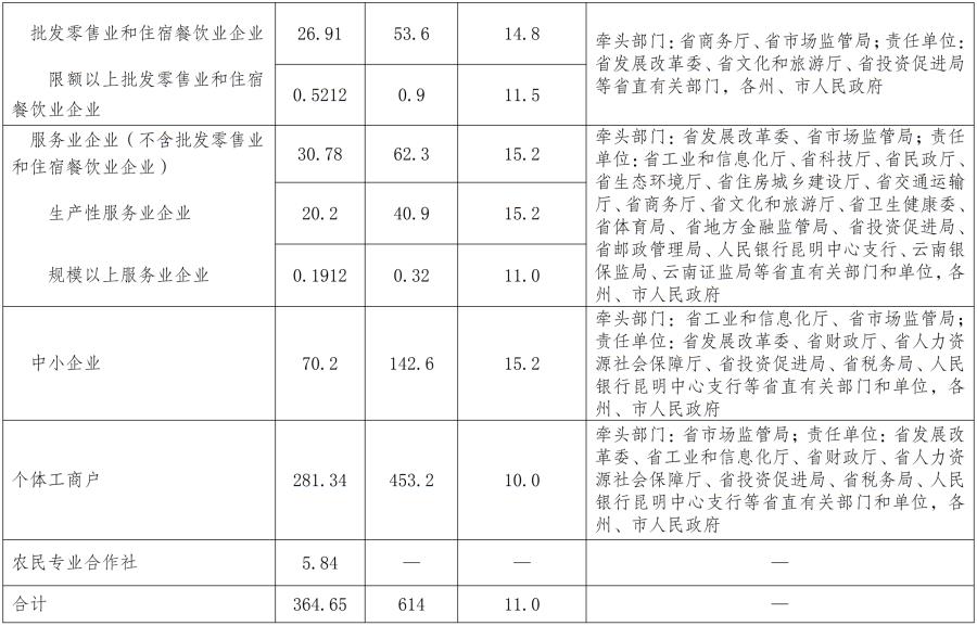 (六)培育中小企业和个体工商户。落实促进民营经济发展的各项政策措施,加快推进民营经济发展。完善省级专精特新中小企业培育政策体系,培育更多“小巨人”企业。设立省级中小企业发展专项资金,聚焦重点产业链上下游市场主体培育,支持中小企业创新能力提升、公共服务平台和融资体系建设。强化中小企业发展统筹协调机制作用,落实落地稳增长有关政策措施,优化中小企业发展支持政策,持续推动减税降费、减租降息、普惠金融等纾困惠企政策直达基层、直接惠及市场主体。进一步完善领导干部挂钩联系民营企业制度,加快构建亲清政商关系,大力弘扬企业家精神。建立扶持个体工商户发展部门联席会议制度,加快完善服务体系,加强创业指导引导,积极协调解决个体工商户租金、税费、社保、融资、用工等方面突出问题。落实“个转企”优惠政策,引导个体工商户转型升级为企业。到2025年,全省中小企业达到142.6万家、年均增长15.2%,个体工商户达到453.2万户、年均增长10.0%。(牵头部门:省工业和信息化厅、省市场监管局;责任单位:省发展改革委、省财政厅、省人力资源社会保障厅、省投资促进局、省税务局、人民银行昆明中心支行等部门和单位,各州、市人民政府)